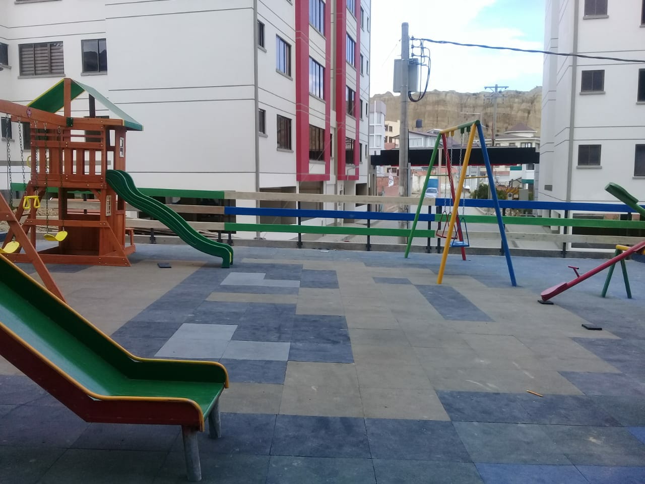 Disfruta de un entorno familiar y seguro para tus hijos, con áreas verdes, parque infantil con seguridad las 24Hrs. y a 3 minutos del Hipermaxi.