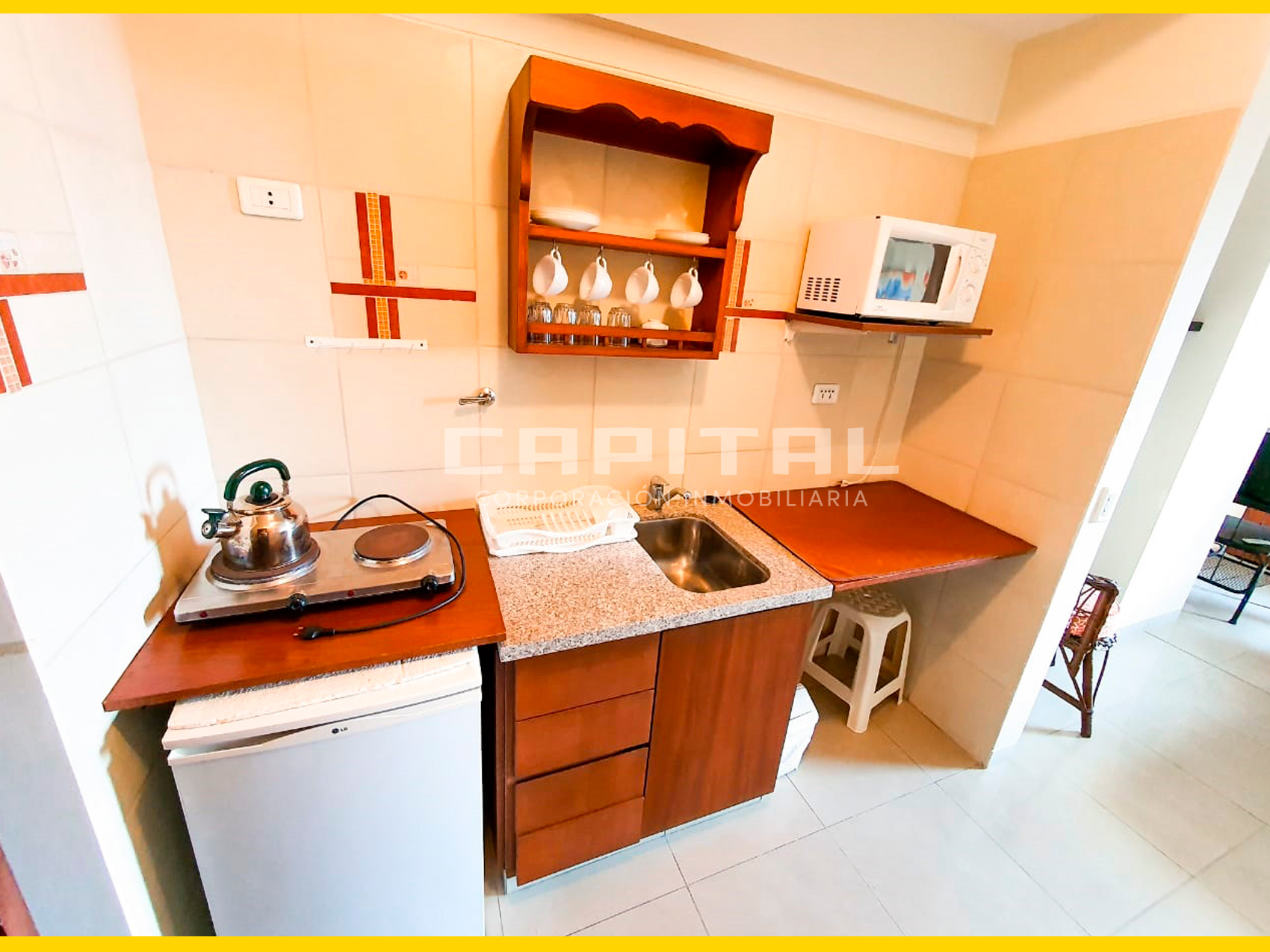 Amoblamiento: juego de dormitorio, sofá cama, comedor, televisor, cocina equipada