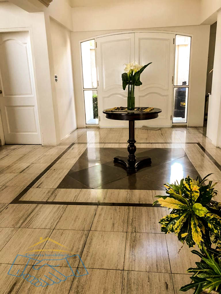 Amplio recibidor de pisos de mármol.