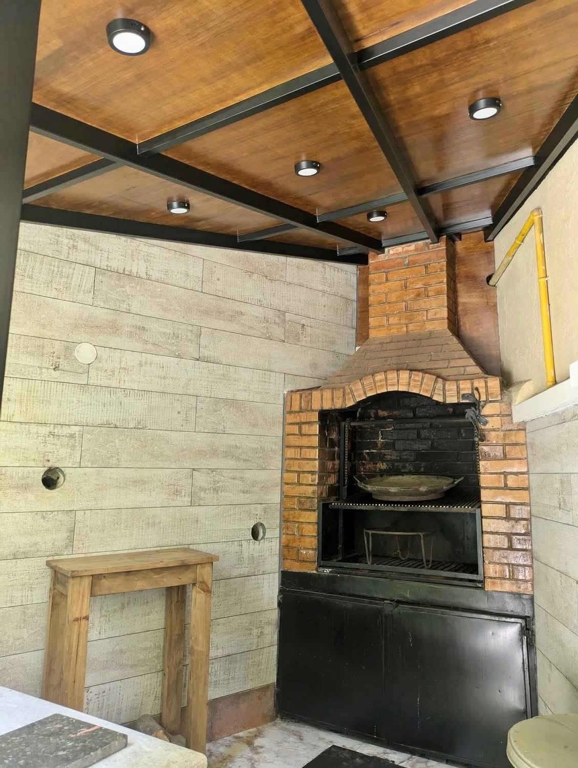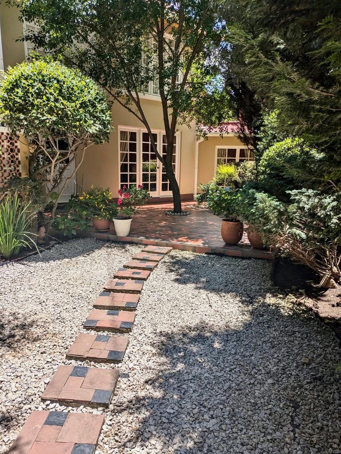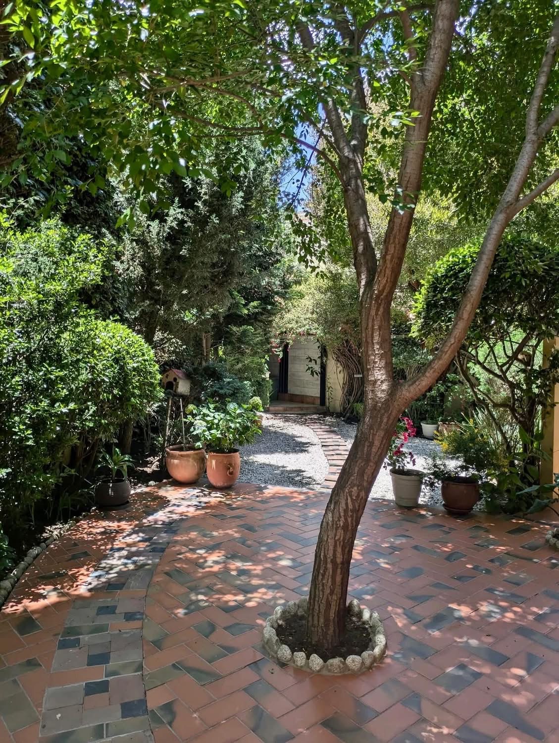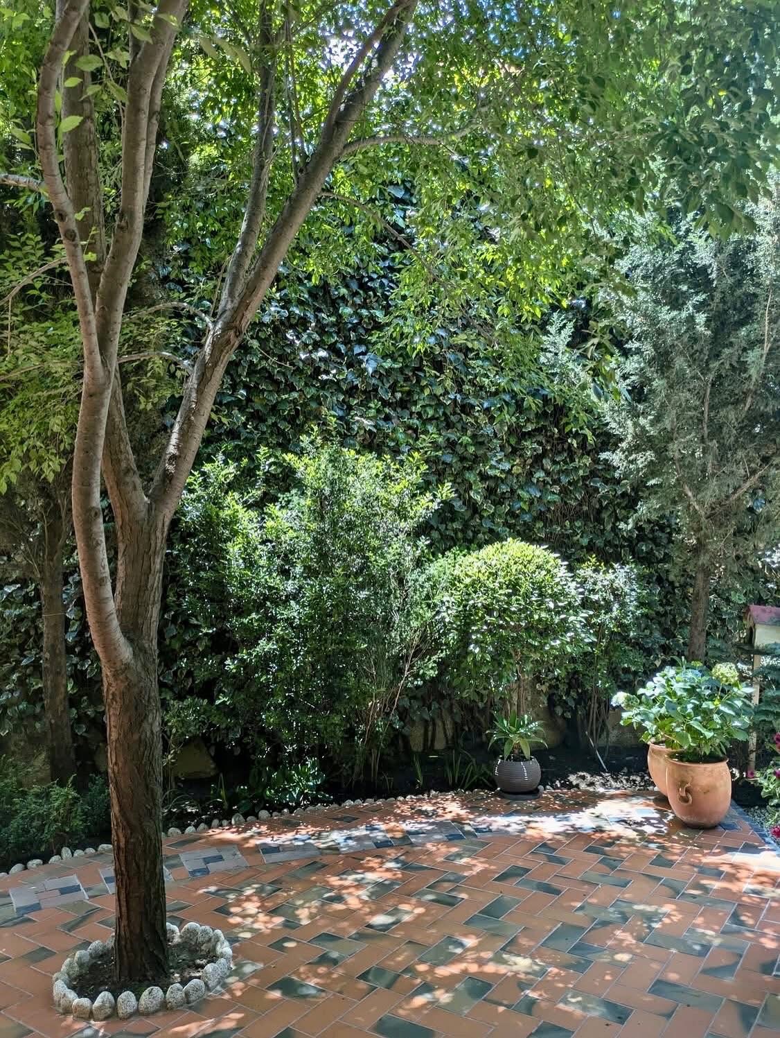 Hermoso patio con parrillero rodeado de plantas decorativas creando un espacio natural ideal para relajarse y disfrutar del aire libre.