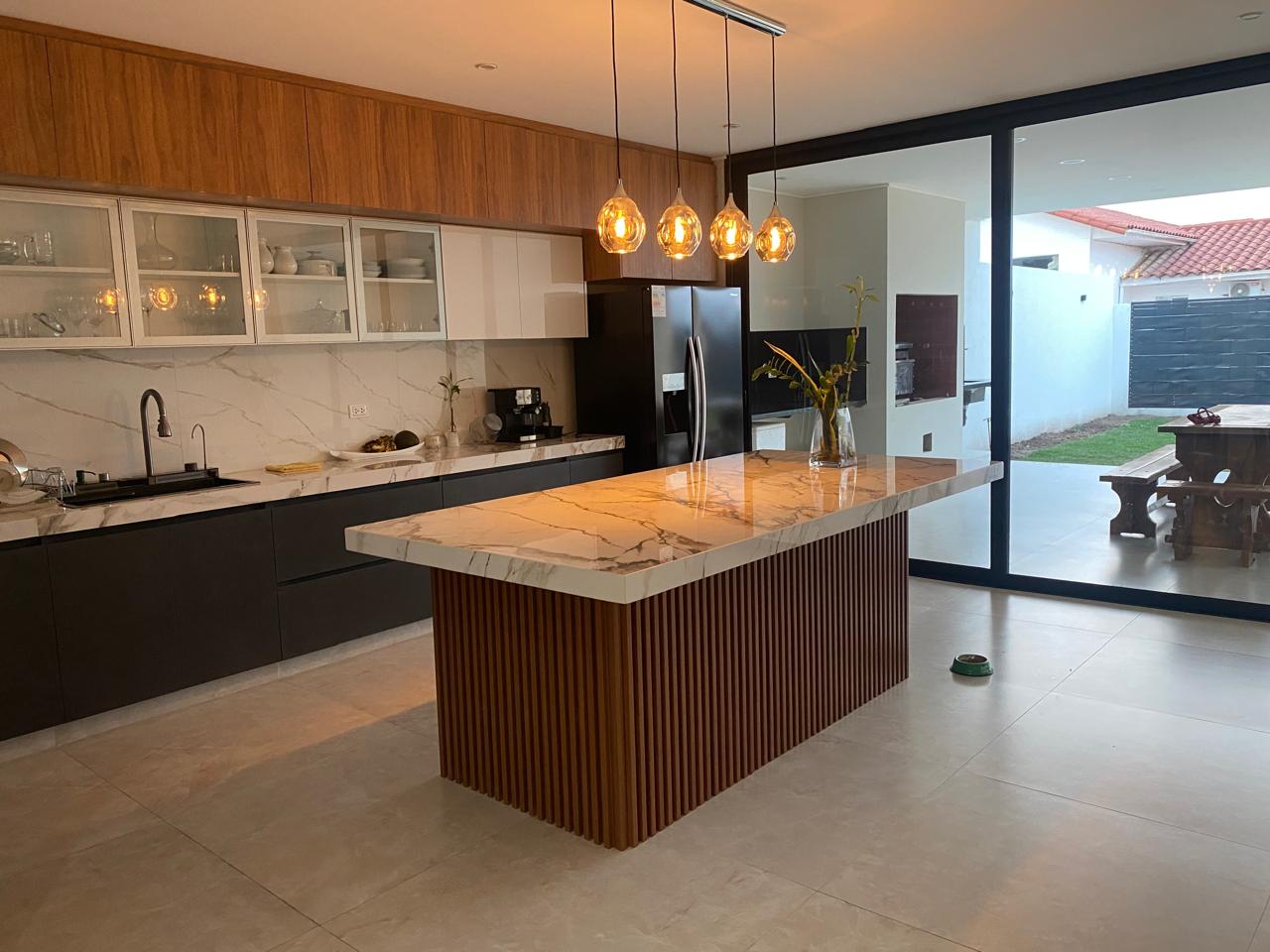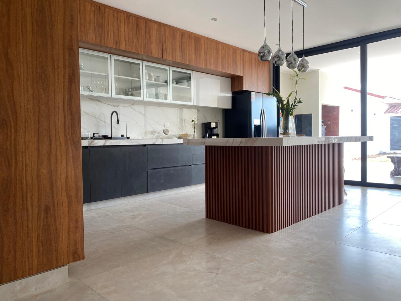 Cocina con mesón de piedra Sintetizada y cajonería alta y baja