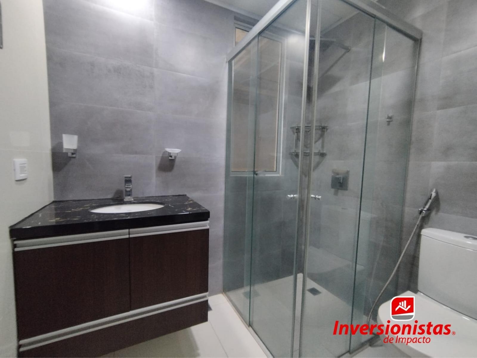Baño con cajonería baja y box de baño
