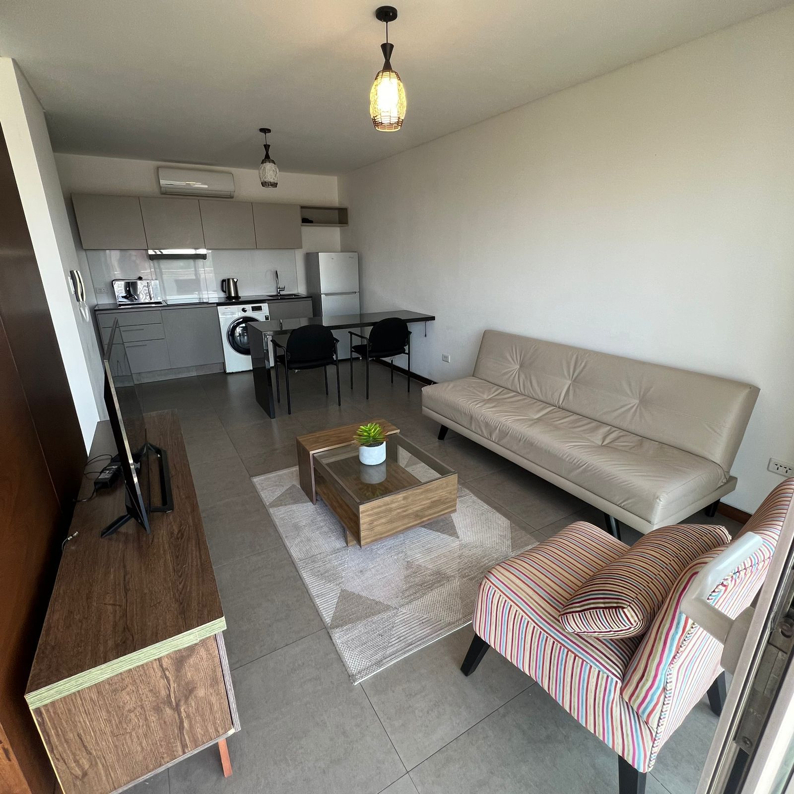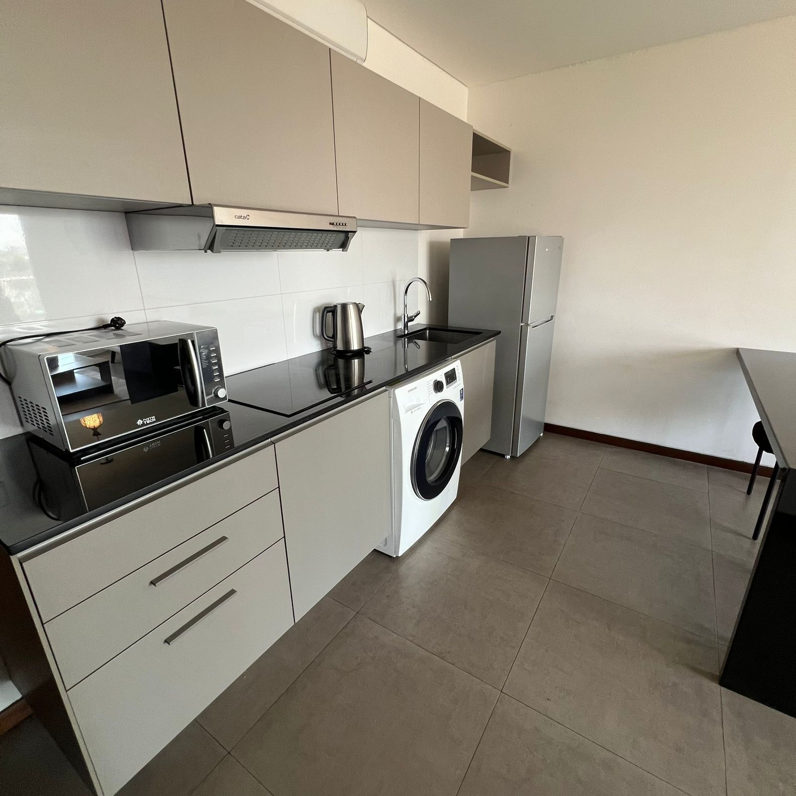 •Cocina integrada totalmente equipada (Heladera, encimera, extractor, lavadora - secadora, microondas)