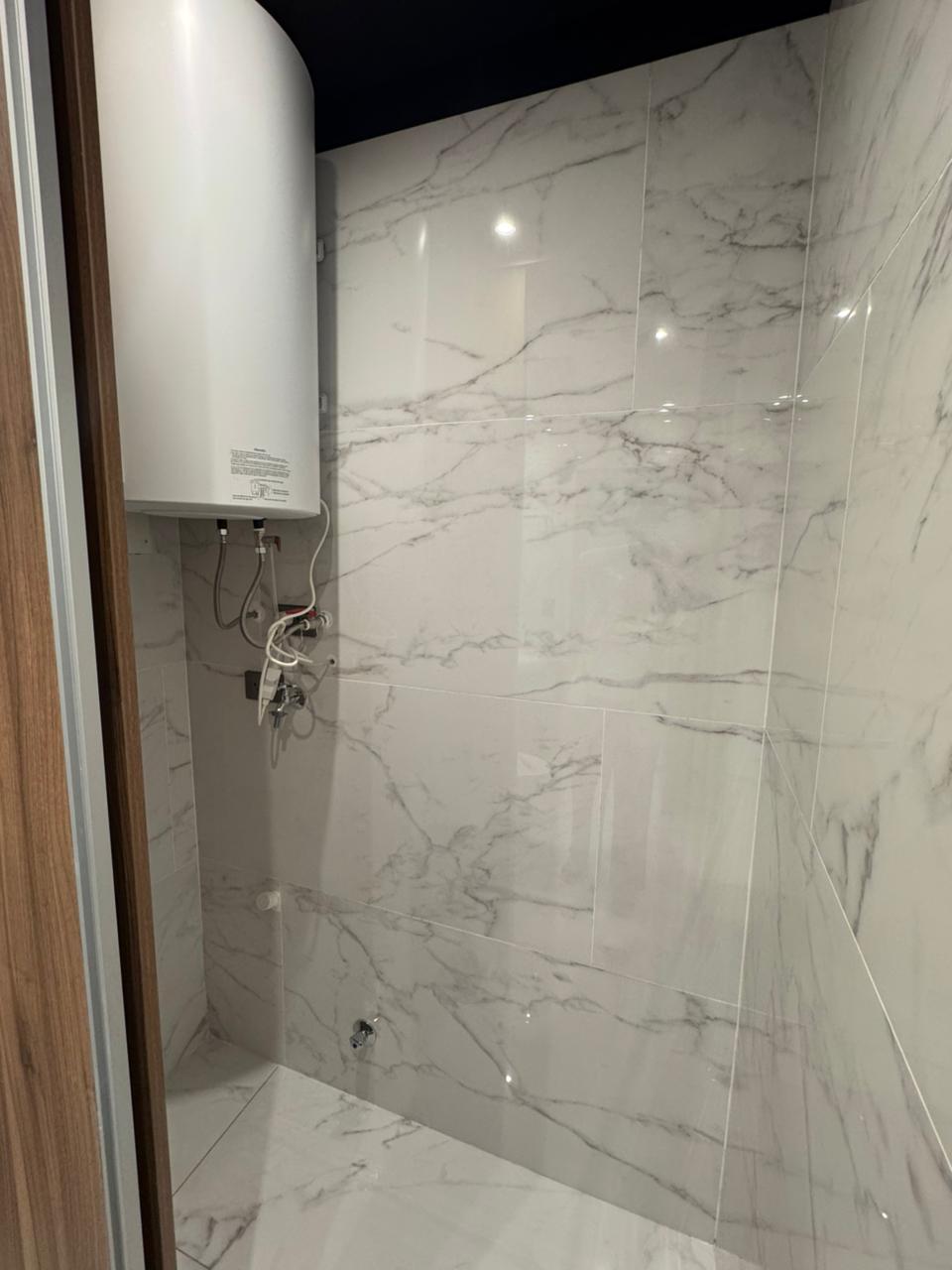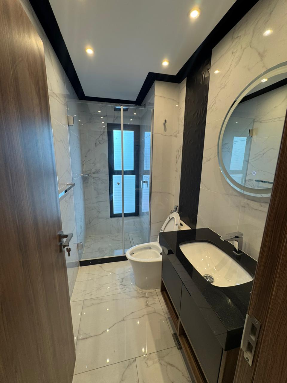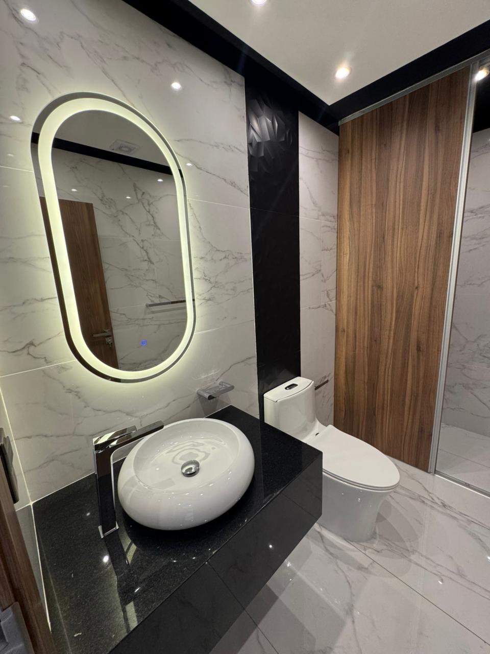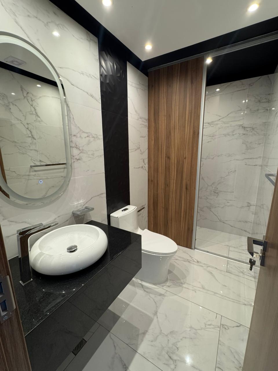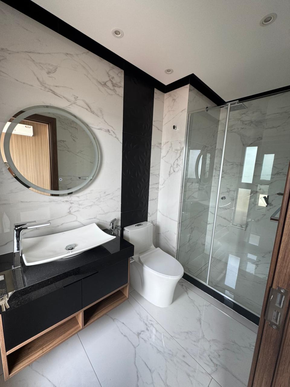 Mobiliario bajo mesón en baños, box de ducha y espejos con luz touch