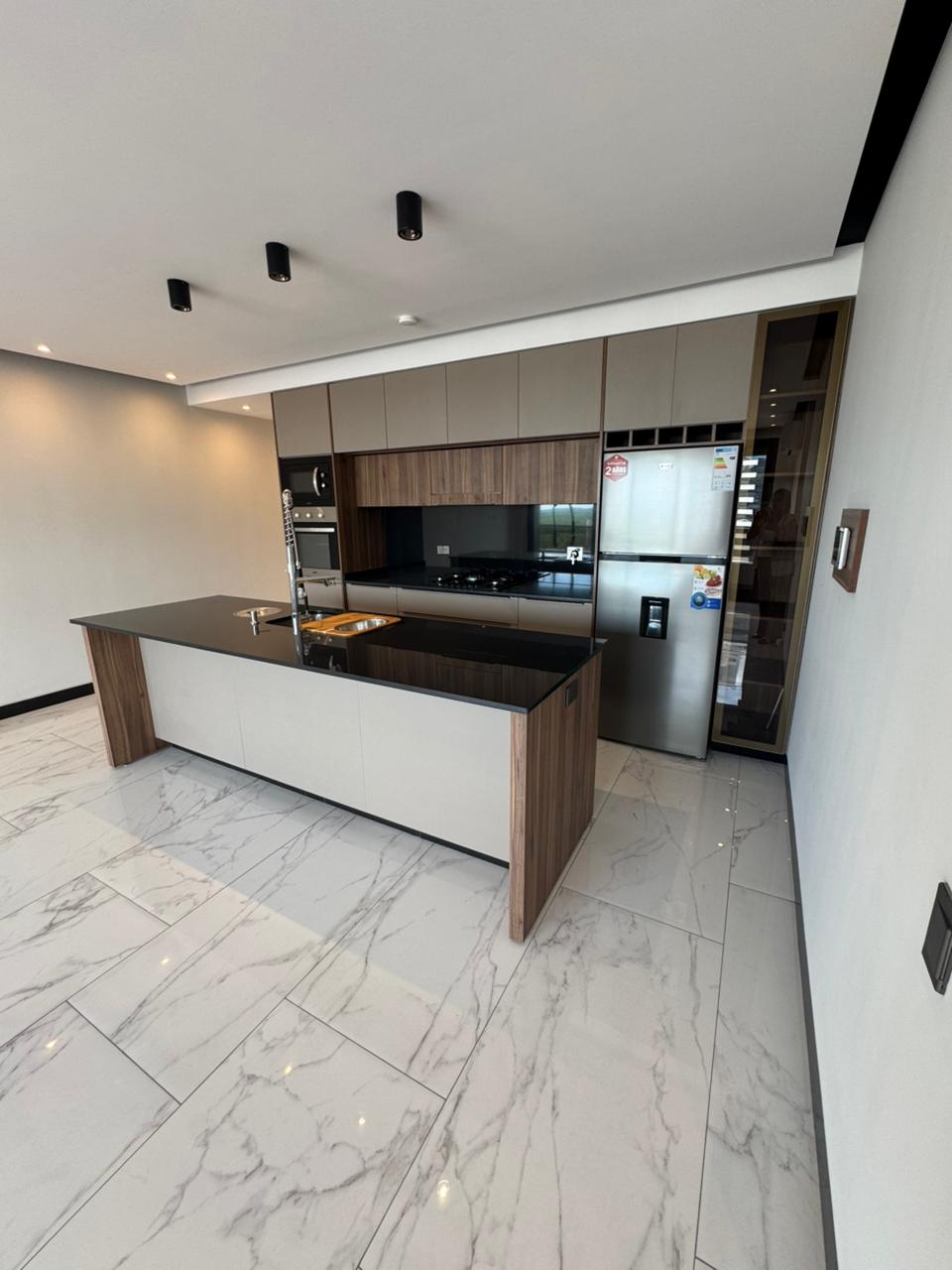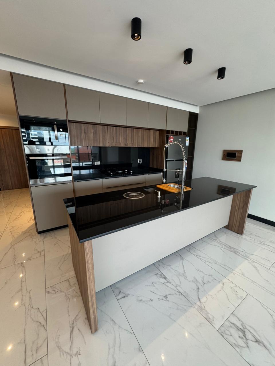 Cocina integrada, totalmente amoblada y equipada (microondas, encimera, extractor, heladera, etc.)