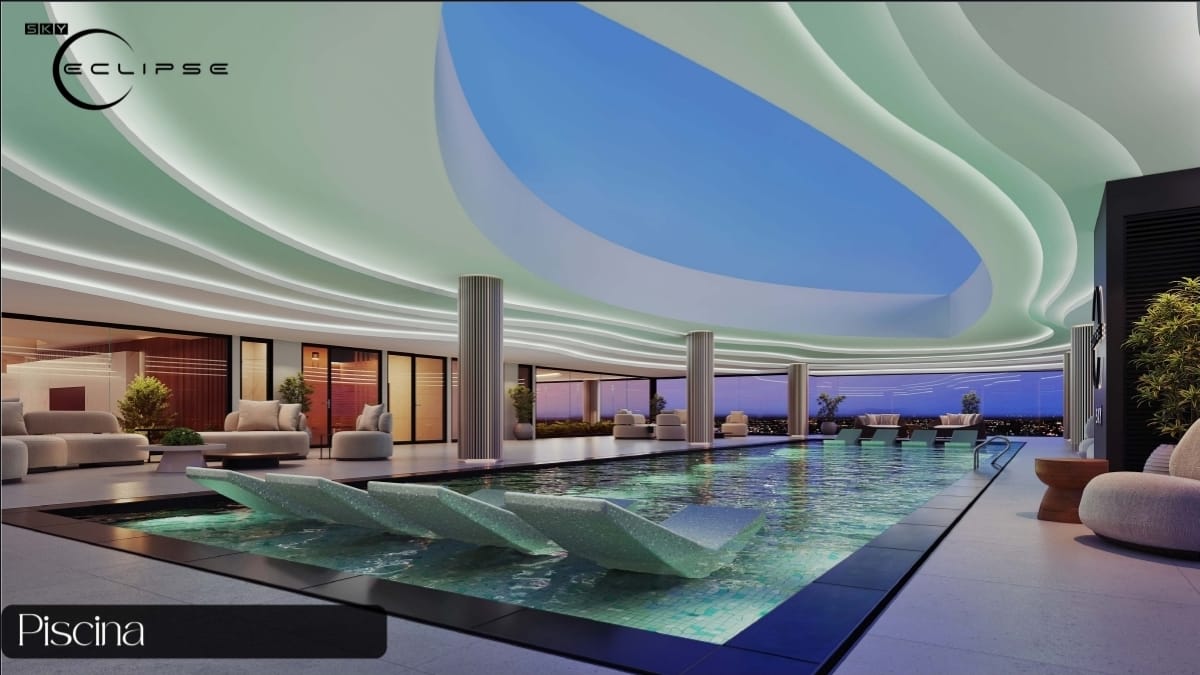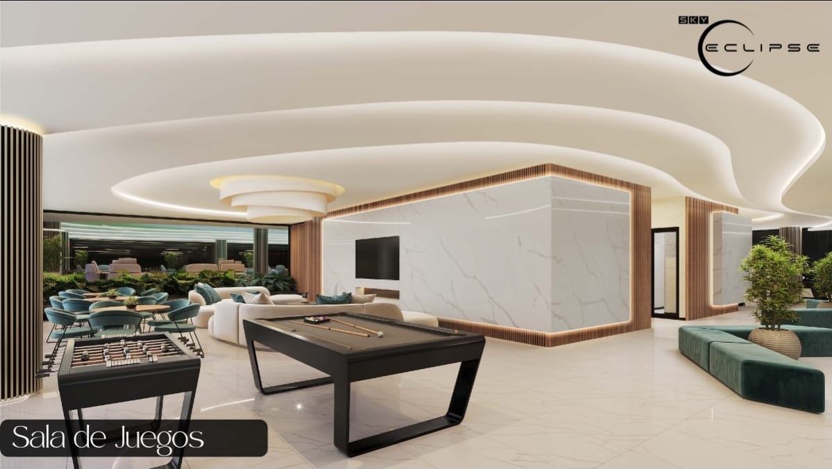 Imponente lobby de ingreso de 150 m², 3 ascensores inteligentes con tarjetas de acceso, piscina panorámica en el piso 17 de 25 metros, saunas, gimnasio, salones, churrasqueras, salas de juego y múltiples ambientes de esparcimiento social.