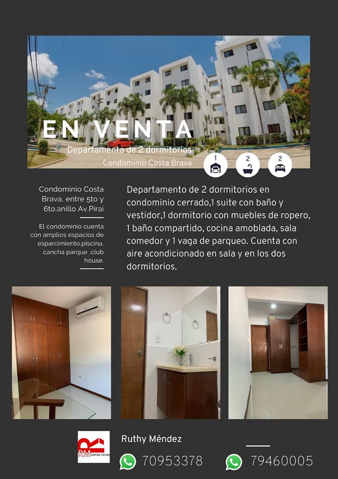 RM bienes raices ofrece para la venta departamento 2 dorm en condominio Costa brava zona oeste av. Piray entre 5to y 6to anillo.