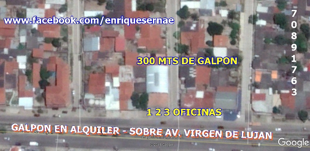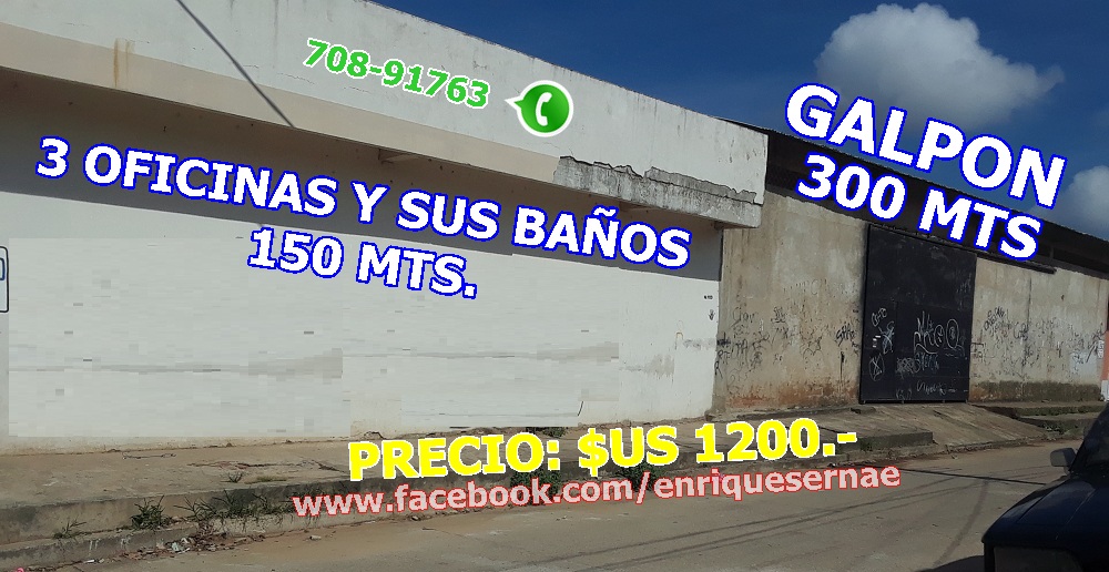 OPCIONAL: También se pueden alquilar las 3 oficinas de 5x9 c/u., su baño y su Galpón cerrado. Precio TODO en: $us 1200.- Superficie total: Mts. 450.-
