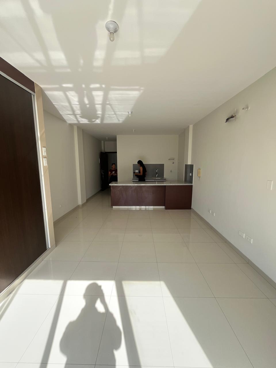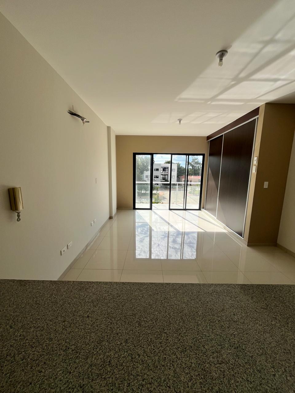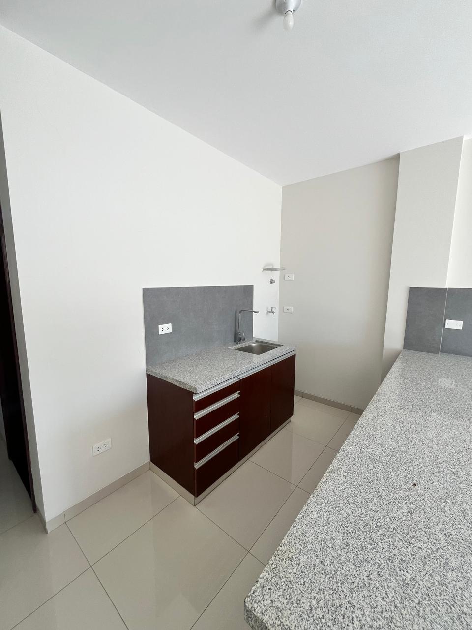 El departamento se entrega con mesones y cajoneria bajo mesón de cocina y baños, puerta de closet y accesorios de baño.